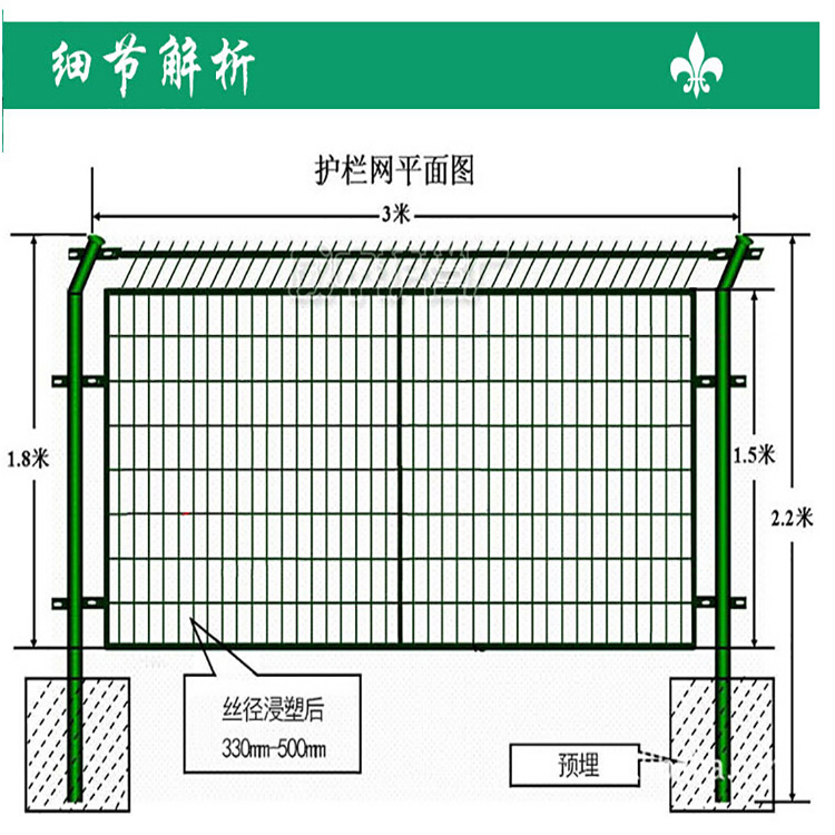 框架護(hù)欄網(wǎng)常見(jiàn)規(guī)格:網(wǎng) 孔(mm):75*150 50*50 50*100 80*160 網(wǎng) 片(mm):1800*3000 邊 框(mm):20x30x1.5或20X40x1.5 網(wǎng)絲浸塑(mm):0.7-0.8 網(wǎng)絲塑后(mm):3.5-6.0mm 立柱尺寸:?48mm×1.0/1.2/1.5/2.0mm厚圓管。 整體彎折:30° 彎折長(zhǎng)度(mm):300 立柱間距(mm):3000 立柱預(yù)埋(mm):250-300 預(yù)埋基礎(chǔ)(mm):500x300x300或400 x400 x400